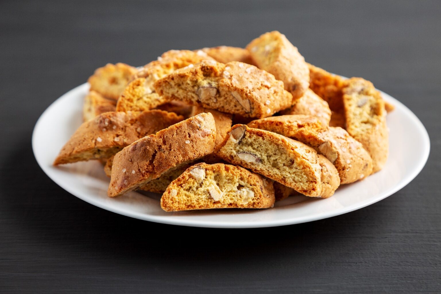 Schneiden Sie nun die Rollen in 1,5 bis 2 cm dicke, diagonale Streifen. Legen Sie die einzelnen Streifen mit etwas Abstand zueinander wieder auf das Blech und wiederholen Sie den Backvorgang bei 160°C für ca. 10 bis 15 Minuten, bis die Streifen goldbraun sind.
